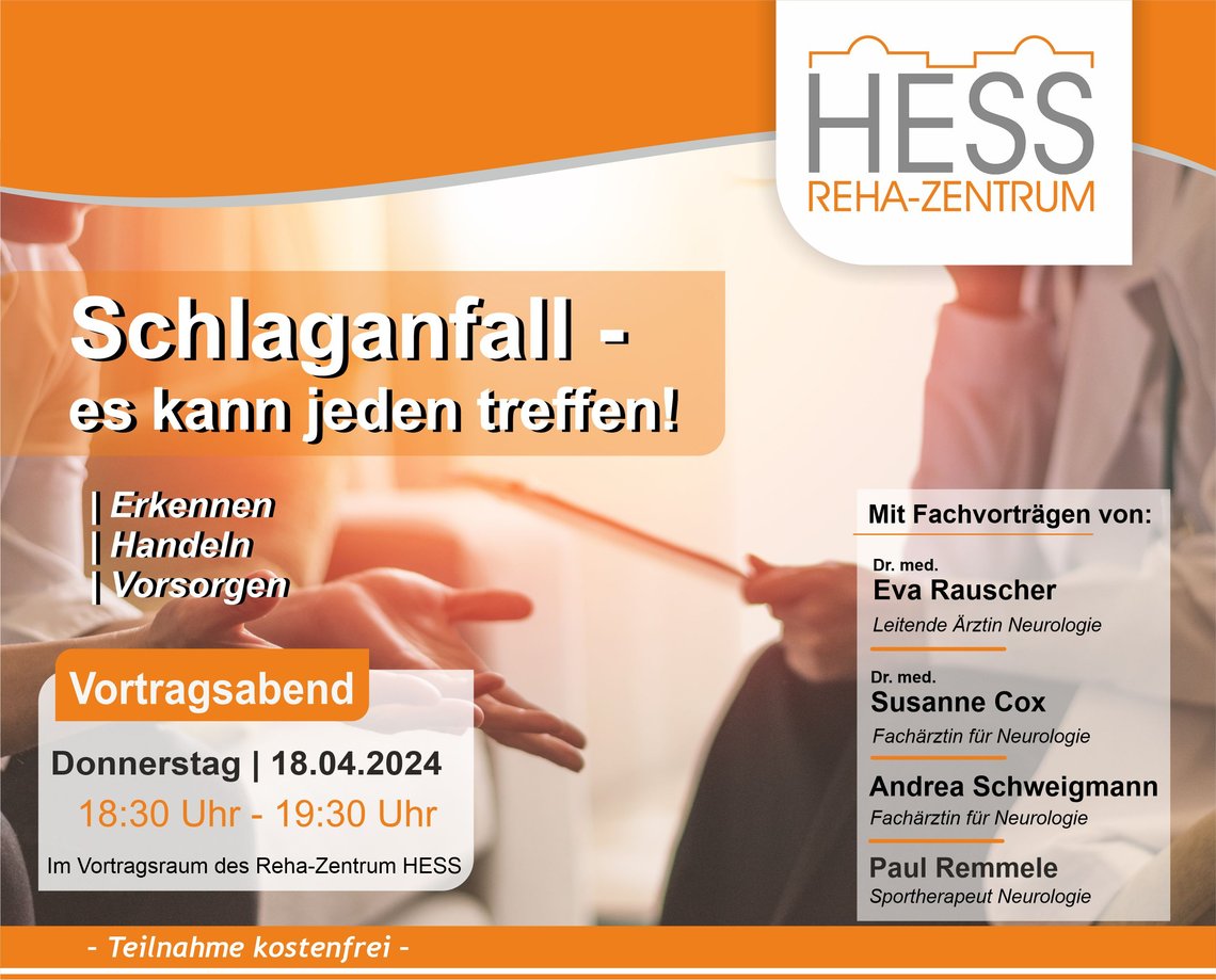 Am Donnerstagabend, den 18. April 2024 laden wir Sie herzlich in das Reha-Zentrum HESS zum Vortragsabend ein. Informieren Sie sich kostenfrei über Schlaganfälle - denn es kann jeden Menschen treffen. Mit Fachvorträgen von unserer Leitenden Ärztin der Neurologie, Dr. med Eva Rauscher und von unseren Fachärztinnen für Neurologie Dr. med Susanne Cox und Andrea Schweigman, erhalten Sie wichtige Informationen zur Früherkennung und Vorsorge rund um Schlaganfälle, sowie Handlungsempfehlungen. Begleitet wird der fachliche Vortrag unserer Ärztinnen von unserem Sporttherapeut Paul Remmele. Er wird spannende Inhalte aus sportherapeutischer Sicht vermitteln. Der Abend findet im Vortragsraum des Reha-Zentrum HESS in der Steinheimer Straße 7 statt. Wir freuen uns auf Ihren Besuch!